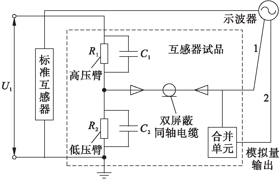 为保证被测电压中各种频率分量均可顺利通过,并以同一变比传输至下一级,应使得电压互感器各部分时间常数一致,为此互感器的电阻电容值应满足:R1C1-(R2//R)(C2+Cc+C)=0,即此时阻容分压器分压比与频率无关,被测电压波形可无畸变传输,满足了互感器传输测量信号的要求.
