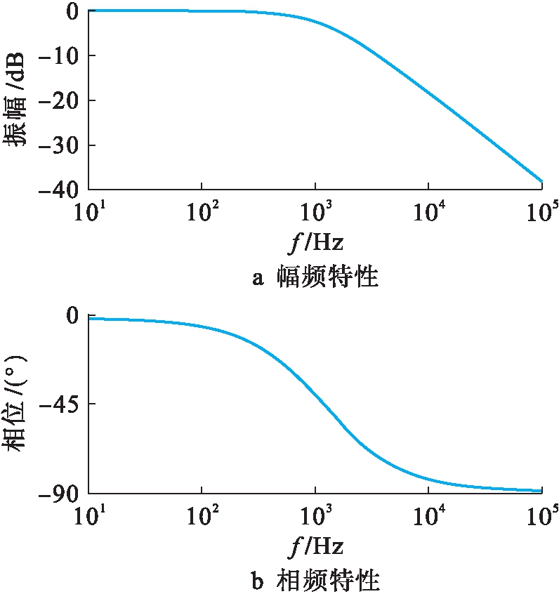 为使电压信号第一次到达传输电缆末端不会发生反射现象,应使滤波器电阻R与传输电缆特性阻抗的数值相等.为此可取R=133 Ω,C=1 μF,此时截止频率为而fc=1 196 Hz>950 Hz,可以通过19次及以下的谐波,符合计量要求.利用MATLAB软件可绘制一阶RC无源低通滤波器的幅频特性曲线和相频特性曲线,如图7所示.