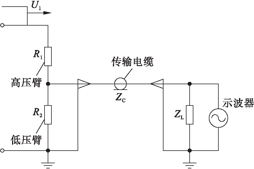 当传输电缆末端阻抗不匹配时,测量信号会在电缆末端发生反射.通常情况下,同轴电缆特征阻抗为50 Ω或75 Ω,而合并单元输入电阻一般达到千欧姆级,远大于电缆特征阻抗.传输电缆末端反射系数较大,末端反射波也较大,入射信号波叠加反射波会出现振荡,造成信号失真,严重影响互感器测量的准确度.因此,有必要针对阻容分压式直流电压互感器的阻抗匹配展开研究.