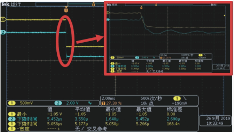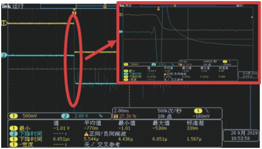 图5中,通道1代表标准器输出波形,通道2代表阻容式电压互感器输出波形,红框图示由示波器水平刻度从2 ms调整到10 μs得到,下同.由图5可知,未连接合并单元时,阻容分压式直流电压互感器阶跃响应波形出现振荡,且有较大的过电压.