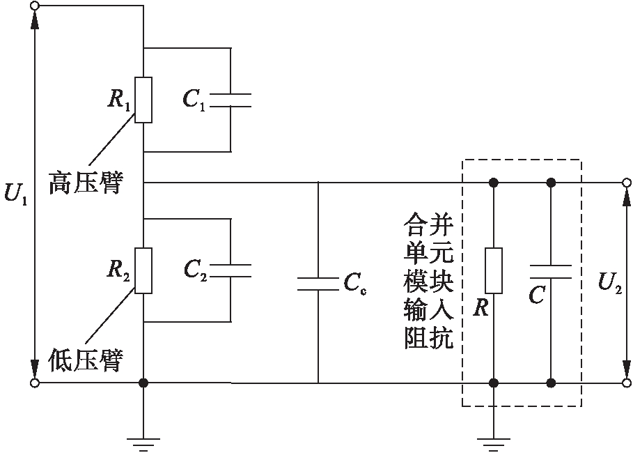 阻容分压式直流电压互感器通常由阻容分压器、双屏蔽电缆及合并单元模块组成,其中阻容分压器包括高压臂和低压臂,由多级电阻和电容进行串并联构成.合并单元模块包括:二次分压回路、转换模块及数据合并单元.低压测量信号经由二次分压回路转换为更低电压等级的直流电压信号,经由数模转换、数据合并、光纤传输等信号处理后输出符合国家标准要求的模拟信号或数字信号.