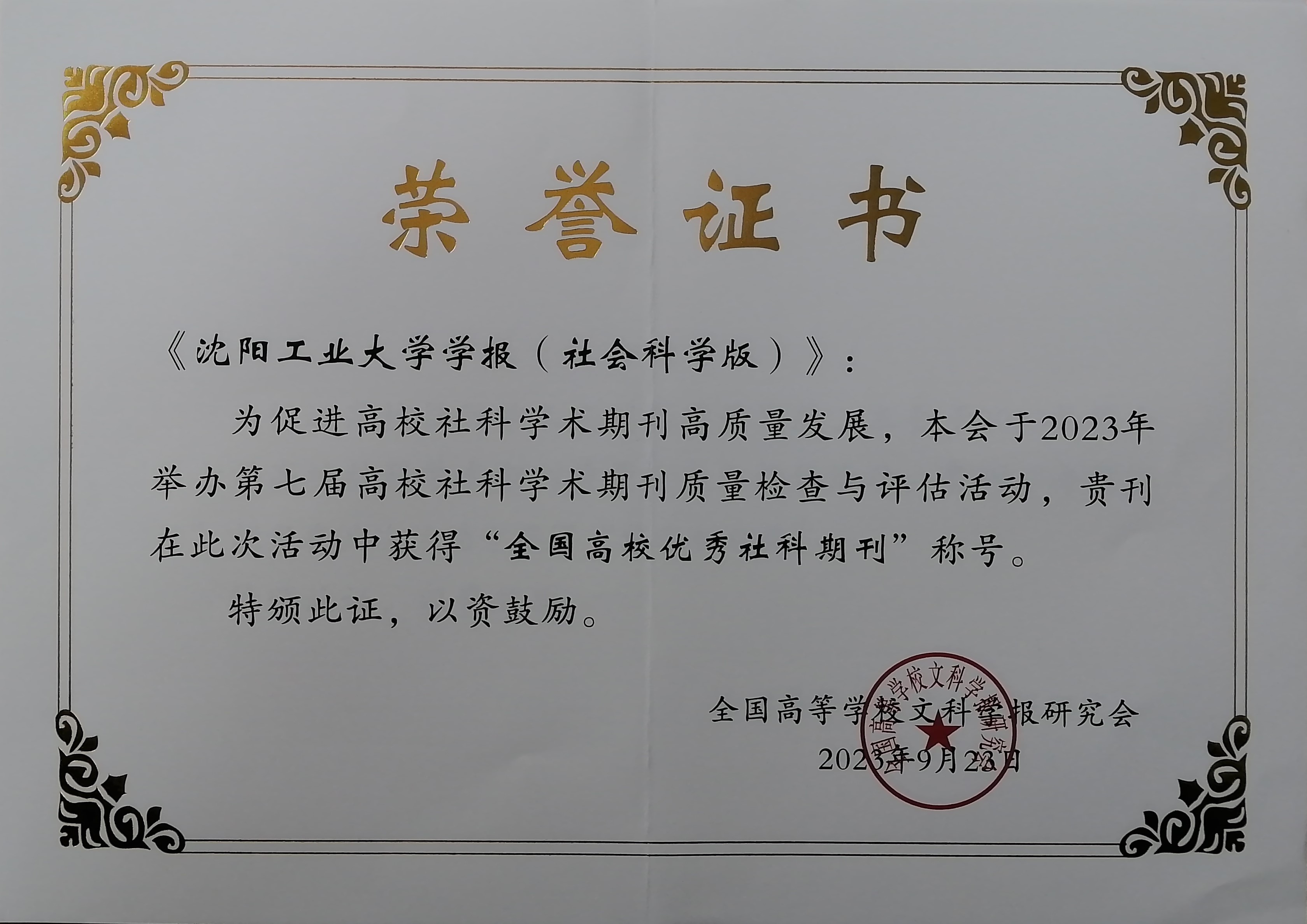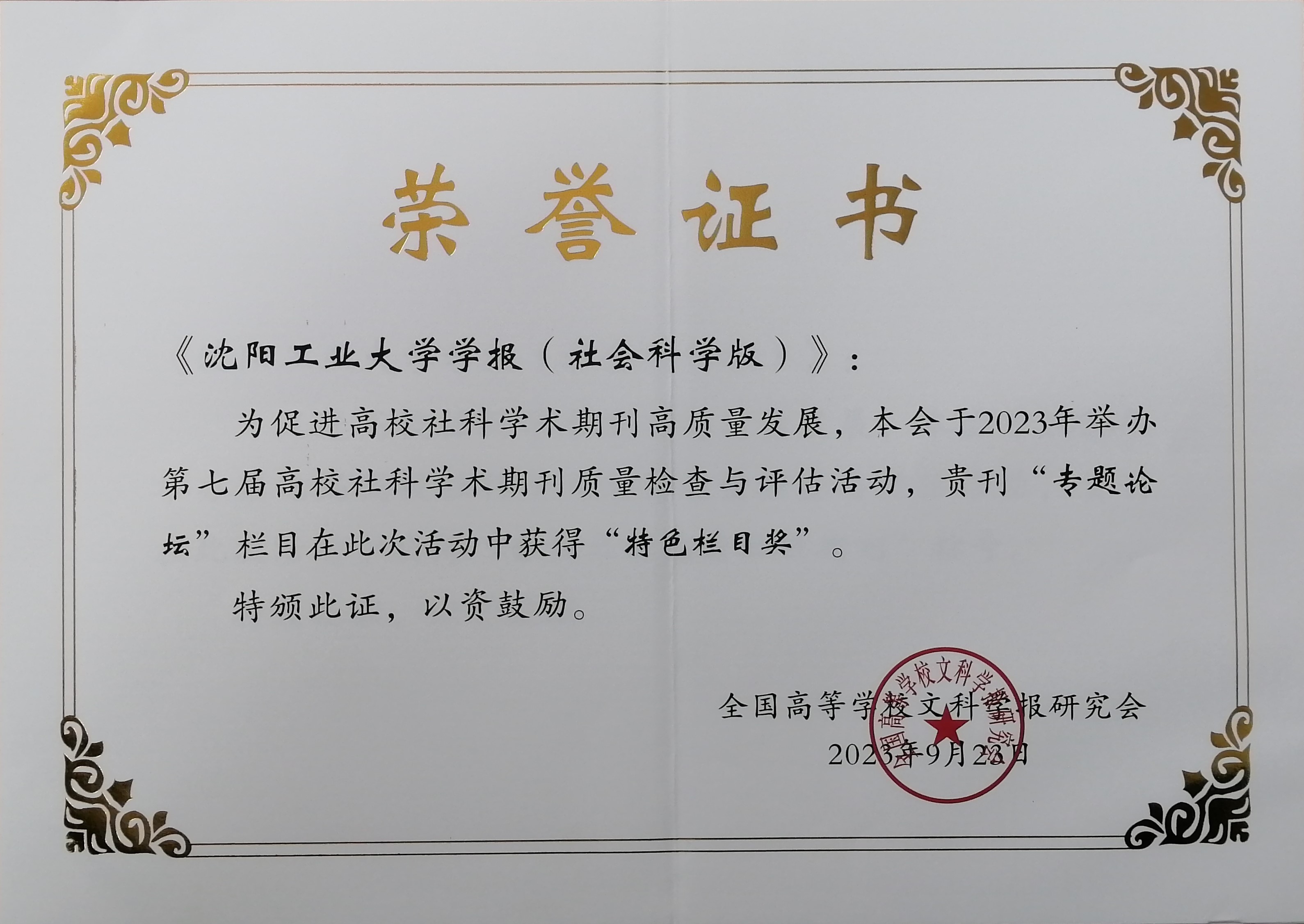 9月23—24日,全国高校文科学报研究会成立35周年庆祝大会暨九届三次理事会在湖北宜昌召开,来自全国高校社科期刊界近700名代表参会。大会公布“第七届高校社科学术期刊质量检查与评估”结果并举行颁奖仪式,《沈阳工业大学学报(社会科学版)》被评为“全国高校优秀社科期刊”,“专题论坛”获“特色栏目奖”。