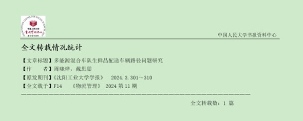 近日,据中国人民大学书报资料中心(http://zlzx.ruc.edu.cn)显示,刊发于本刊2024年第3期的《多能源混合车队生鲜品配送车辆路径问题研究》一文,被人大《复印报刊资料》《物流管理》2024年第11期全文转载。