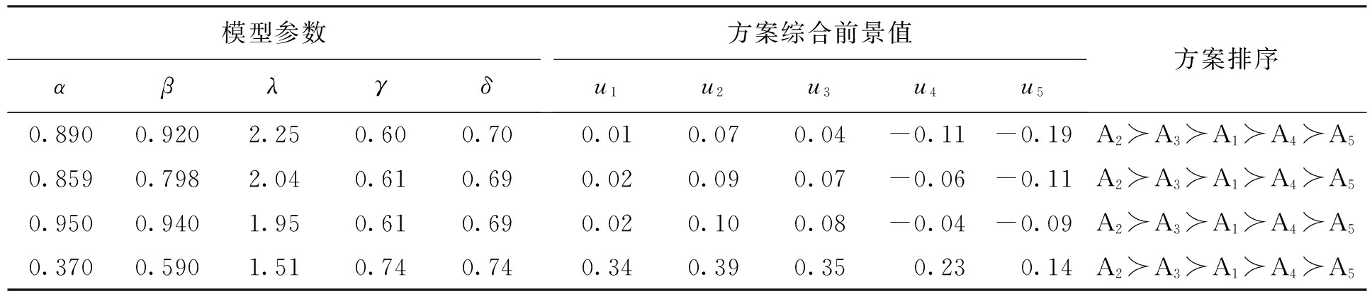 为了进一步验证模型参数取值的变化对决策结果的影响,这里选择了6种具有代表性的参数取值,分别计算各方案相应的综合前景值,并得到方案的排序结果,具体如表4所示。