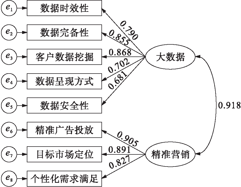 (3) 大数据和精准营销之间的路径系数为0.918,表明大数据与精准营销相关性极为显著。