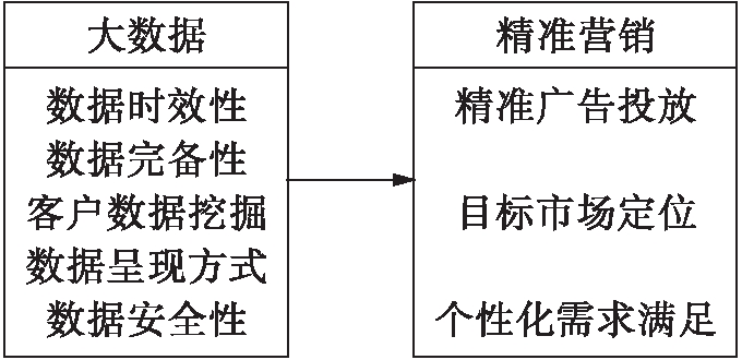 大数据时代的到来使在可接受时间内处理庞大数据集成为可能,大数据所具有的大分析、高带宽和大内容特点产生了数据生成、采集、储存以及分析的数据价值链,给现代企业带来了一定的机遇和挑战。大数据成为下一个创新、竞争和生产力的前沿[1-2]。在大数据背景下,企业充分利用大数据提供的数据处理和分析技术,提出了精准营销这一营销新方法。精准营销改变了以往的营销渠道和方法,通过互联网等方式建立客户数据库并进行科学分析,为企业提供更精准的营销沟通模式[3-4]。因此,大数据为精准营销的实施提供了基础和技术平台。与此同时,基于精准营销定位,企业建立个性化服务模式,实现了高效率低成本的目标[5],也为企业对大数据的管理提供了一定的方向。因此,对大数据和企业精准营销的相关性进行分析有助于企业经营者充分利用大数据技术有针对性地实施精准营销,从而达到提高企业市场竞争力的目的。