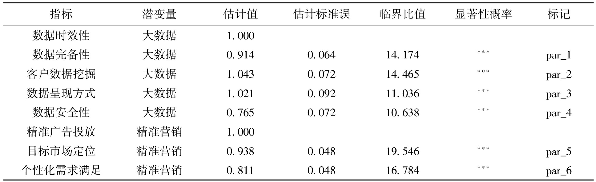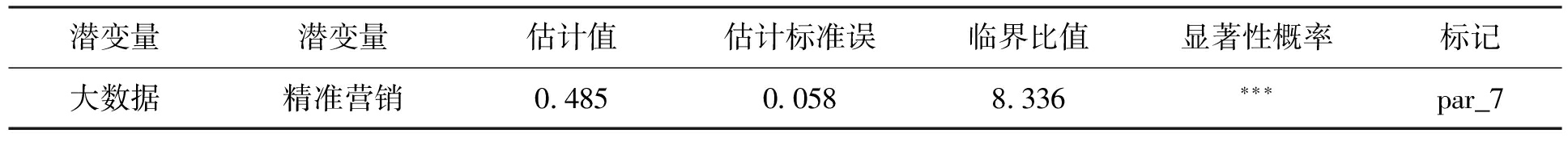 由表11可知,各拟合指标数值均在拟合标准内,说明整体拟合度较好,因此大数据与精准营销相关性模型整体拟合度检验通过。