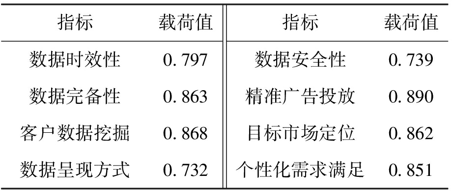 由表3、4可知,大数据量表和精准营销量表的Cronbach’sα值分别为0.934和0.924,均大于0.8,表明两个量表都具有较高的信度。