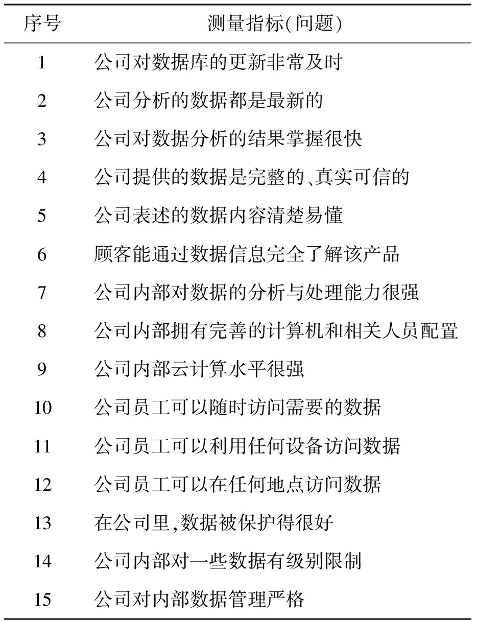 本文所使用的大数据量表借Barnes和Vidgen开发的量表[25],并根据研究对象进行适当的删减与修改,从数据时效性、数据完备性、客户数据挖掘、数据呈现方式和数据安全性方面进行调查问卷设计。问卷共15个题目,均为正向题目,采用Likert五点量表计分,分数愈高代表大数据效果愈好,具体如表1所示。