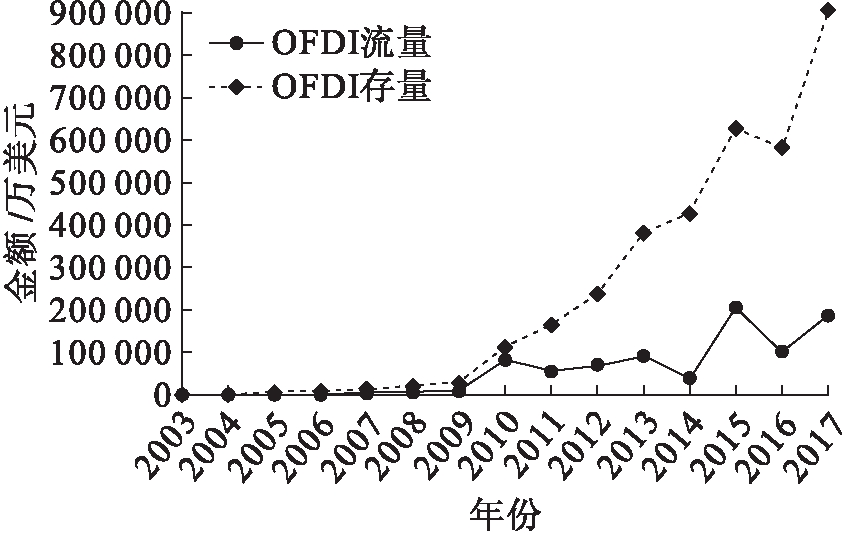 图2 2003—2017年安徽省非金融类对外直接投资存量和流量