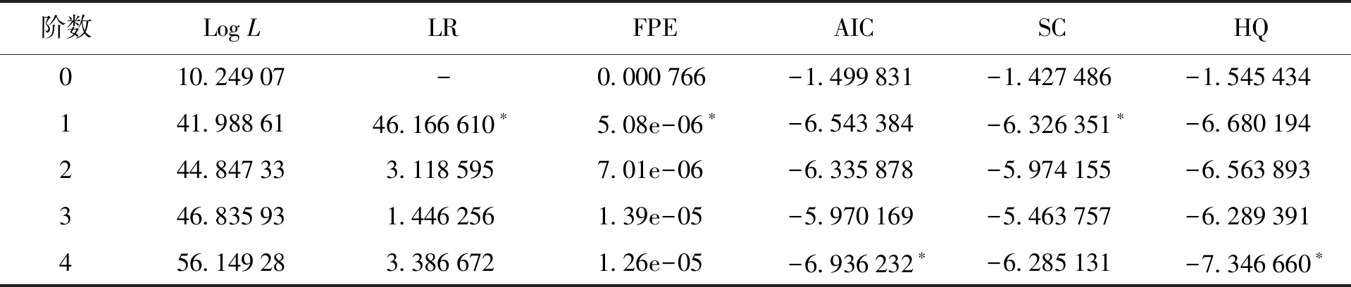 注:*为该准则选择的滞后阶数;Log L为最大似然函数值;LR为似然比检验;FPE为最终预测误差;AIC为贝叶斯信息准则;SC、HQ为信息准则。