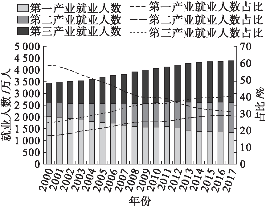 图8 2000—2017年安徽省三大产业就业人数构成情况