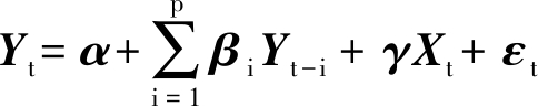 式中:Yt为k阶内生变量向量;α为常数向量;Yt-i为Yt的第i阶滞后内生变量向量;Xt为外生变量向量;βi和γ为系数矩阵;p为滞后阶数;t为时期跨度;εt为k维随机扰动向量。