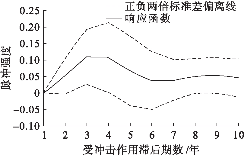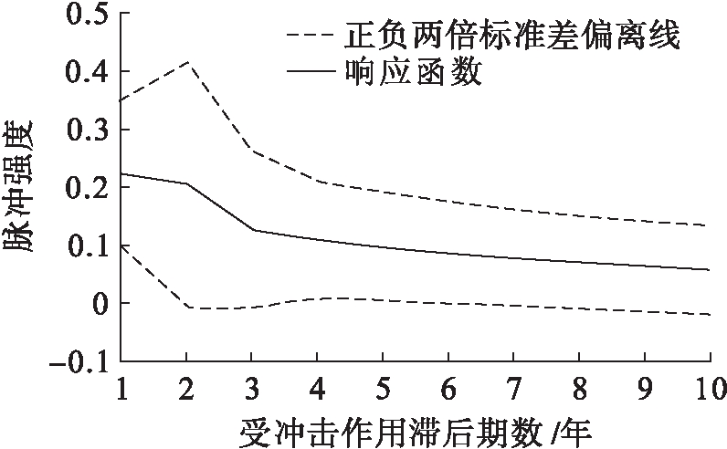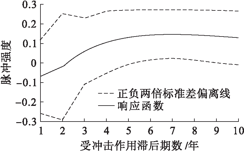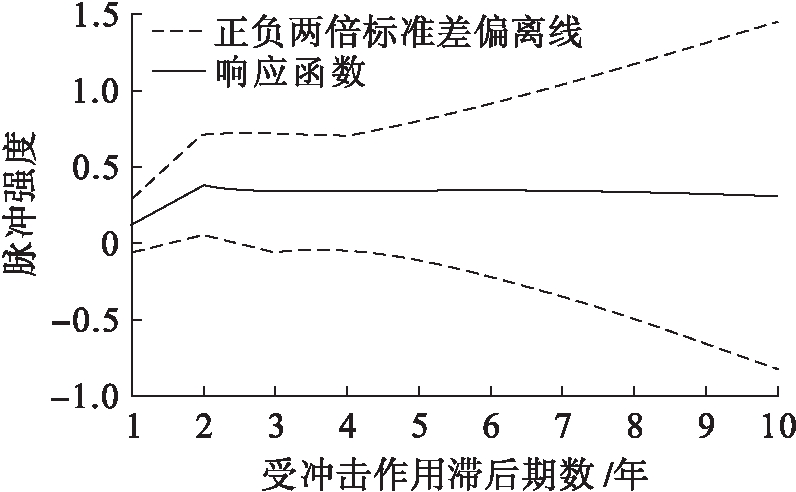 建立VAR模型后,进一步进行稳定性检验。通过AR根图示法检验(见图9)可知,VAR模型特征方程根的倒数均位于单位圆内,说明所构建的VAR模型具有整体的稳定性,可以进行脉冲响应分析。