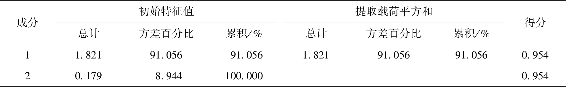 成分初始特征值总计方差百分比累积/% 提取载荷平方和总计方差百分比累积/% 得分11.82191.05691.0561.82191.05691.0560.95420.1798.944100.0000.954