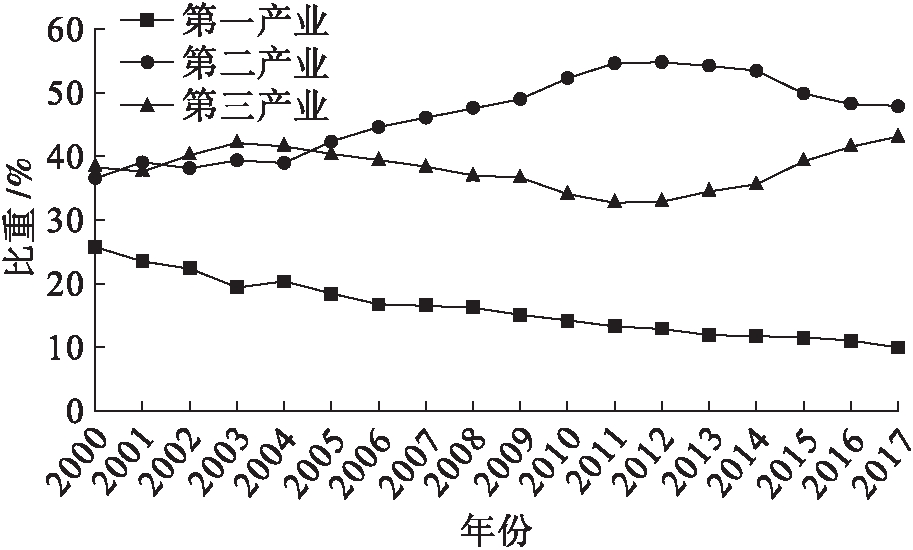 图7 2000—2017年安徽省三大产业GDP占比情况