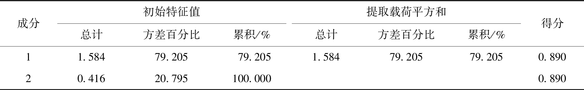 成分初始特征值总计方差百分比累积/% 提取载荷平方和总计方差百分比累积/% 得分11.58479.20579.2051.58479.20579.2050.89020.41620.795100.0000.890