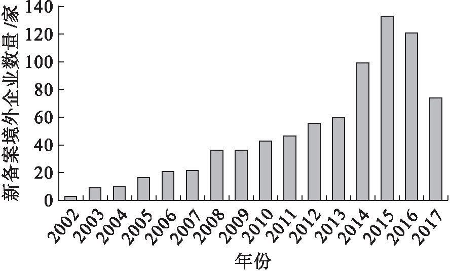 图3 2002—2017年安徽省对外直接投资新备案境外企业数量
