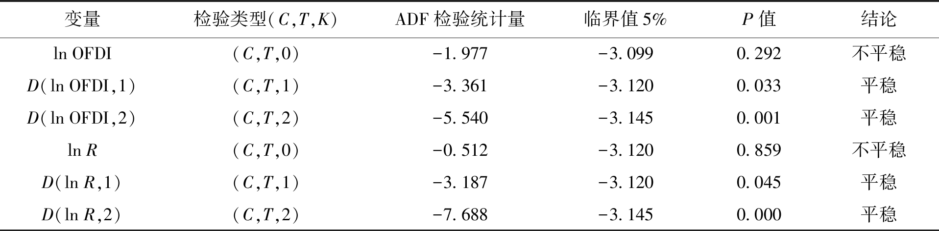 首先采用ADF检验法对变量进行平稳性检验,以避免出现伪回归问题,检验结果如表1所示。由表1可知,ln OFDI和ln R的ADF检验统计量均大于临界值5%的显著水平,表明ln OFDI和ln R时间序列均不平稳,存在单位根。故采用差分法对ln OFDI和ln R取一阶差分和二阶差分,进一步进行平稳性检验。在5%的显著性水平下,ADF检验统计量均小于对应临界值,表明已不存在单位根,ln OFDI和ln R的一阶差分和二阶差分的序列数据均平稳,ln OFDI、ln R均为一阶单整序列。