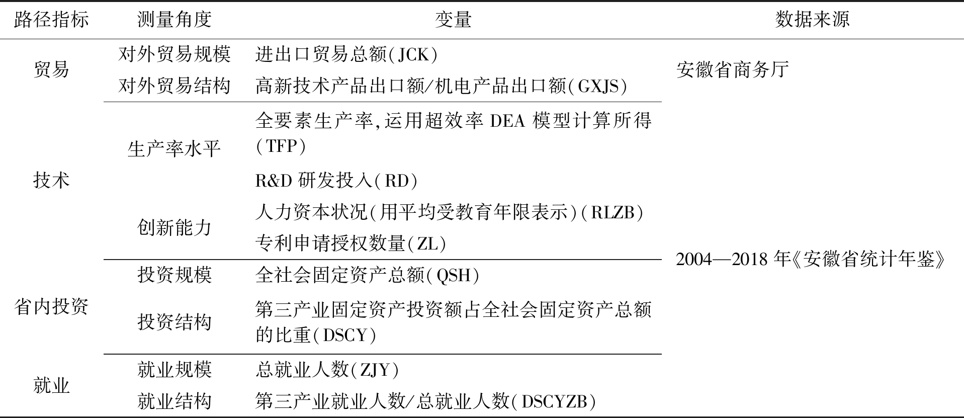 路径指标测量角度变量数据来源贸易技术省内投资就业对外贸易规模对外贸易结构生产率水平创新能力投资规模投资结构就业规模就业结构进出口贸易总额(JCK)高新技术产品出口额/机电产品出口额(GXJS)全要素生产率,运用超效率DEA模型计算所得(TFP)R&D研发投入(RD)人力资本状况(用平均受教育年限表示)(RLZB)专利申请授权数量(ZL)全社会固定资产总额(QSH)第三产业固定资产投资额占全社会固定资产总额的比重(DSCY)总就业人数(ZJY)第三产业就业人数/总就业人数(DSCYZB)安徽省商务厅2004—2018年《安徽省统计年鉴》