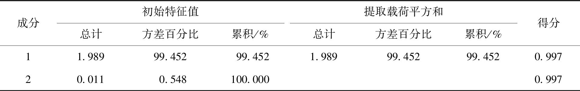 成分初始特征值总计方差百分比累积/% 提取载荷平方和总计方差百分比累积/% 得分11.98999.45299.4521.98999.45299.4520.99720.0110.548100.0000.997