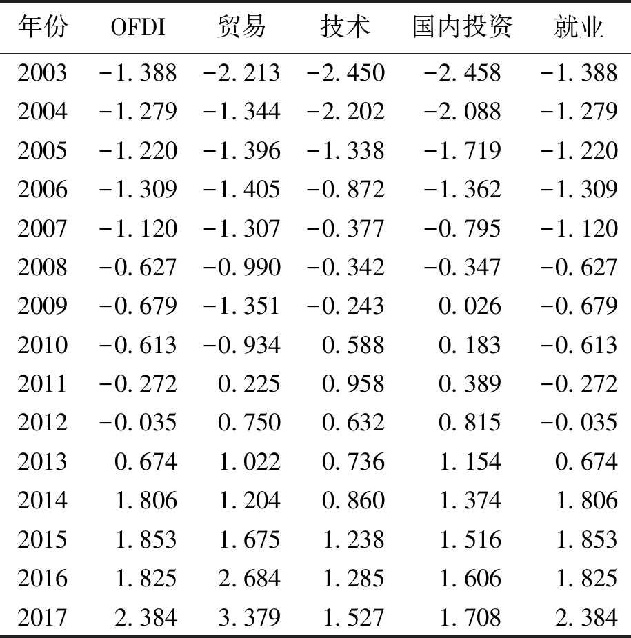 年份OFDI贸易技术国内投资就业2003-1.388-2.213-2.450-2.458-1.3882004-1.279-1.344-2.202-2.088-1.2792005-1.220-1.396-1.338-1.719-1.2202006-1.309-1.405-0.872-1.362-1.3092007-1.120-1.307-0.377-0.795-1.1202008-0.627-0.990-0.342-0.347-0.6272009-0.679-1.351-0.2430.026-0.6792010-0.613-0.9340.5880.183-0.6132011-0.2720.2250.9580.389-0.2722012-0.0350.7500.6320.815-0.03520130.6741.0220.7361.1540.67420141.8061.2040.8601.3741.80620151.8531.6751.2381.5161.85320161.8252.6841.2851.6061.82520172.3843.3791.5271.7082.384