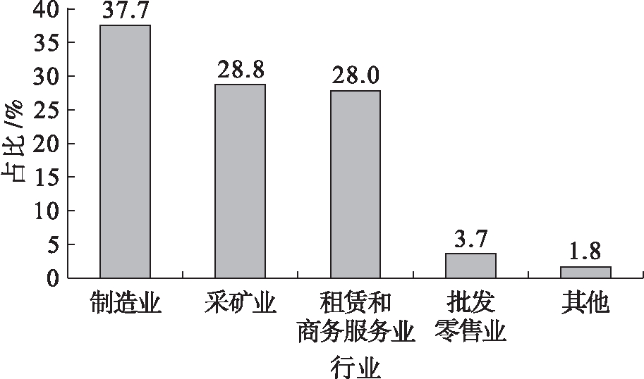 而从对外投资的具体行业来看,安徽省近年来对外投资已基本覆盖了国民经济三大产业中的所有行业类别,其中以制造业为核心(见图4)。由图4可知,安徽省对外投资合作中,制造业以20.4亿美元居首位,占全省对外投资存量的37.7%;其次是采矿业15.6亿美元,占28.8%;租赁和商务服务业以15.2亿美元位列第三,占28%;批发零售业占3.7%;建筑业、电力、热力、燃气及水的生产和供应等其他行业仅占1.8%。这说明安徽省OFDI主要以第二产业为主,虽涉足了第三产业的众多行业,但总量占比过小。
