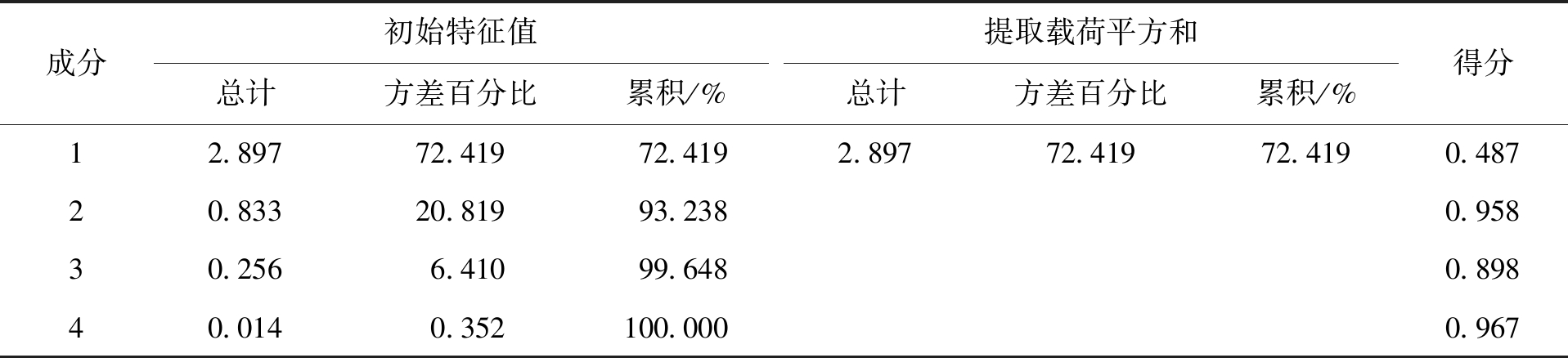 成分初始特征值总计方差百分比累积/% 提取载荷平方和总计方差百分比累积/% 得分12.89772.41972.4192.89772.41972.4190.48720.83320.81993.2380.95830.2566.41099.6480.89840.0140.352100.0000.967