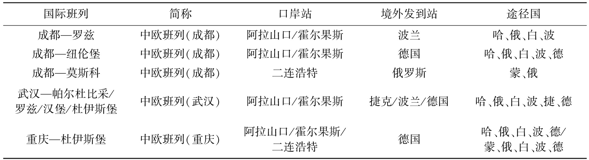 国际班列简称口岸站境外发到站途径国成都—罗兹中欧班列(成都)阿拉山口/霍尔果斯波兰哈、俄、白、波成都—纽伦堡中欧班列(成都)阿拉山口/霍尔果斯德国哈、俄、白、波、德成都—莫斯科中欧班列(成都)二连浩特俄罗斯蒙、俄武汉—帕尔杜比采/罗兹/汉堡/杜伊斯堡中欧班列(武汉)阿拉山口/霍尔果斯捷克/波兰/德国哈、俄、白、波、捷、德重庆—杜伊斯堡中欧班列(重庆)阿拉山口/霍尔果斯/二连浩特德国哈、俄、白、波、德/蒙、俄、白、波、德