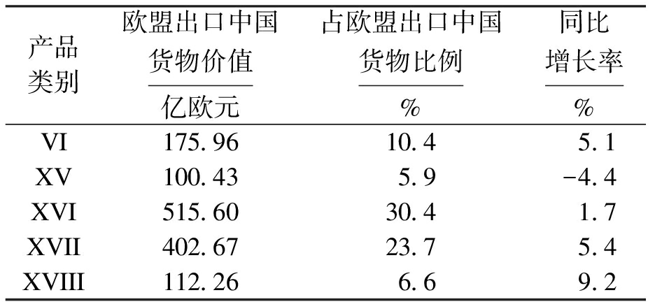 产品类别欧盟出口中国货物价值亿欧元占欧盟出口中国货物比例%同比增长率%VI175.9610.4 5.1XV100.435.9-4.4XVI515.6030.41.7XVII402.6723.75.4XVIII112.266.69.2