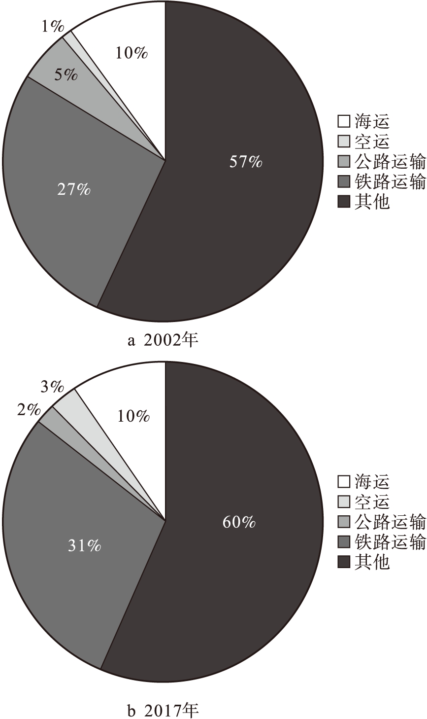 图7 2002年和2017年欧洲对中国出口运输方式占比