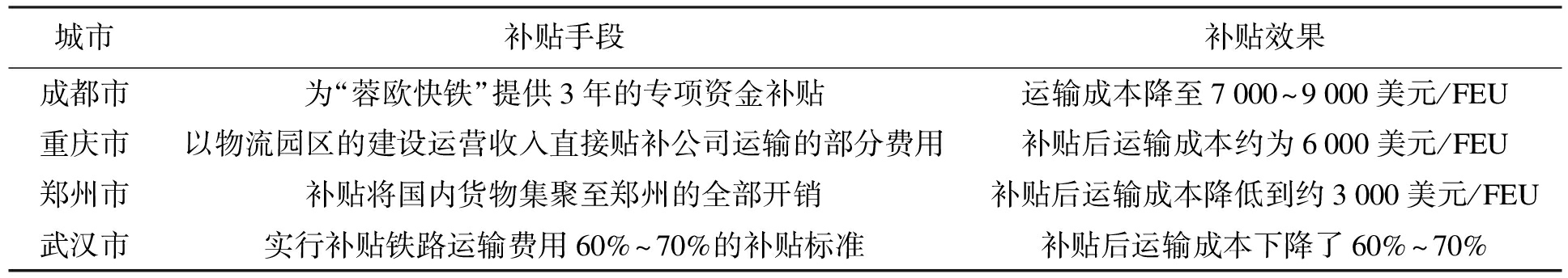 城市补贴手段补贴效果成都市为“蓉欧快铁”提供3年的专项资金补贴运输成本降至7000~9000美元/FEU重庆市以物流园区的建设运营收入直接贴补公司运输的部分费用补贴后运输成本约为6000美元/FEU郑州市补贴将国内货物集聚至郑州的全部开销补贴后运输成本降低到约3000美元/FEU武汉市实行补贴铁路运输费用60%~70%的补贴标准补贴后运输成本下降了60%~70%