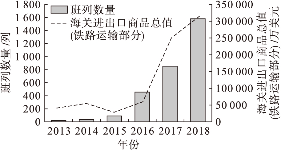 中欧班列的开通成为促进中欧贸易增长的重要动力,对中国西部地区的贸易拉动尤为明显[4]。中欧班列的开通,在一定程度上解决了我国西部地区海上交通不便且境内交通运输成本高的问题,缩短了西部地区进出口产品的运输距离,拓宽了西部地区对外贸易的通道选择。以西部地区城市——成都市为例,图1为2013—2018年中欧班列(成都)历年开行数量以及海关进出口商品总值(铁路运输部分)的相关数据。