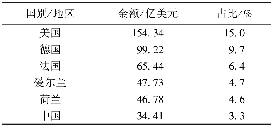 国别/地区金额/亿美元占比/%美国154.3415.0德国99.229.7法国65.446.4爱尔兰47.734.7荷兰46.784.6中国34.413.3