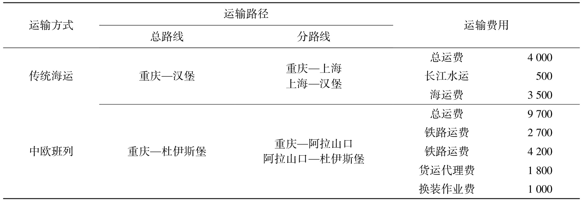 运输方式运输路径总路线分路线运输费用传统海运中欧班列重庆—汉堡重庆—杜伊斯堡重庆—上海上海—汉堡重庆—阿拉山口阿拉山口—杜伊斯堡总运费4000长江水运500海运费3500总运费9700铁路运费2700铁路运费4200货运代理费1800换装作业费1000