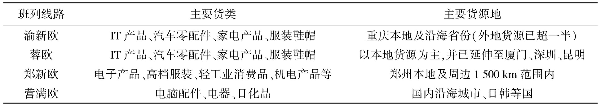 班列线路主要货类主要货源地渝新欧IT产品、汽车零配件、家电产品、服装鞋帽重庆本地及沿海省份(外地货源已超一半)蓉欧IT产品、汽车零配件、家电产品、服装鞋帽以本地货源为主,并已延伸至厦门、深圳、昆明郑新欧电子产品、高档服装、轻工业消费品、机电产品等郑州本地及周边1500km范围内营满欧电脑配件、电器、日化品国内沿海城市、日韩等国