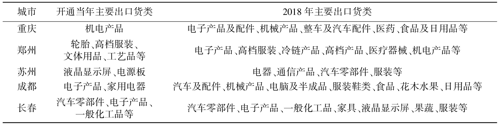 城市开通当年主要出口货类2018年主要出口货类重庆机电产品电子产品及配件、机械产品、整车及汽车配件、医药、食品及日用品等郑州轮胎、高档服装、文体用品、工艺品等电子产品、高档服装、冷链产品、高档产品、医疗器械、机电产品等苏州液晶显示屏、电源板电器、通信产品、汽车零部件、服装等成都电子产品、家用电器汽车及配件、机械产品、电脑及半成品、服装鞋类、食品、花木水果、日用品等长春汽车零部件、电子产品、一般化工品等汽车零部件、电子产品、一般化工品、家具、液晶显示屏、果蔬、服装等
