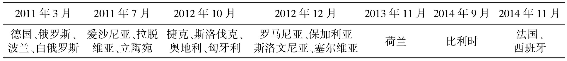 2011年3月2011年7月2012年10月2012年12月2013年11月2014年9月2014年11月德国、俄罗斯、波兰、白俄罗斯爱沙尼亚、拉脱维亚、立陶宛捷克、斯洛伐克、奥地利、匈牙利罗马尼亚、保加利亚斯洛文尼亚、塞尔维亚荷兰比利时法国、西班牙