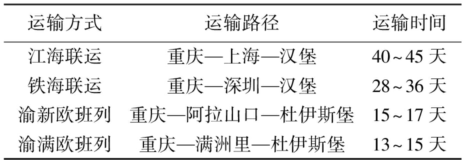 运输方式运输路径运输时间江海联运重庆—上海—汉堡40~45天铁海联运重庆—深圳—汉堡28~36天渝新欧班列重庆—阿拉山口—杜伊斯堡15~17天渝满欧班列重庆—满洲里—杜伊斯堡13~15天