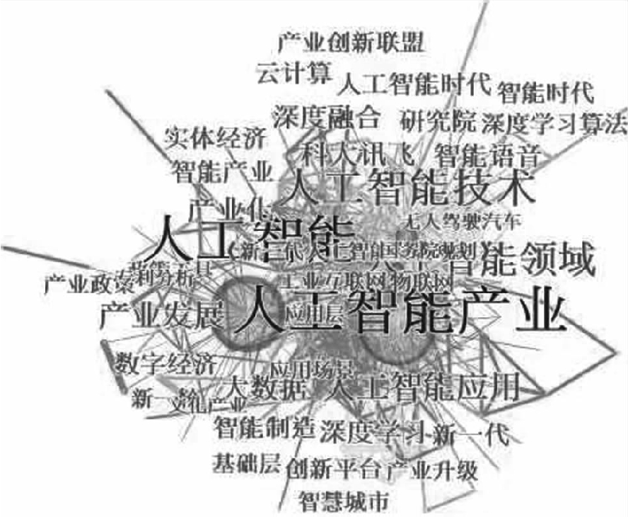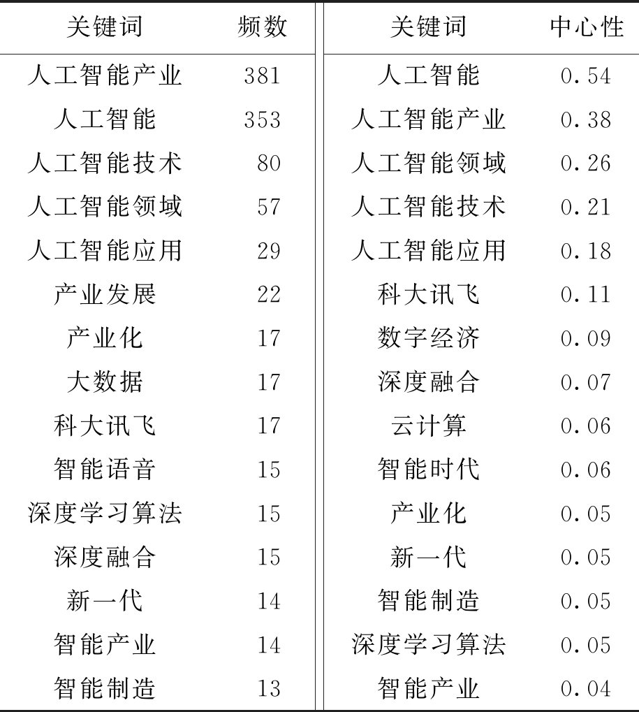关键词频数人工智能产业381人工智能353人工智能技术80人工智能领域57人工智能应用29产业发展22产业化17大数据17科大讯飞17智能语音15深度学习算法15深度融合15新一代14智能产业14智能制造13关键词中心性人工智能0.54人工智能产业0.38人工智能领域0.26人工智能技术0.21人工智能应用0.18科大讯飞0.11数字经济0.09深度融合0.07云计算0.06智能时代0.06产业化0.05新一代0.05智能制造0.05深度学习算法0.05智能产业0.04