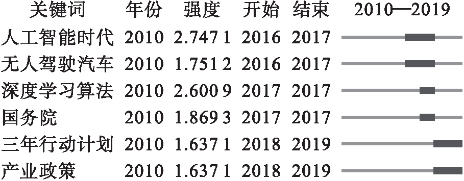 利用CiteSpace进行突现关键词检测,可以探知一个领域的新兴研究主题。图4为人工智能产业研究相关文献的突现关键词,突发性节点变粗部分所对应的关键词在相应时间段内使用频率突然增加,据此可判定该领域的前沿主题[37-38]。在图4中,“三年行动计划”和“产业政策”的突现时段均为2018—2019年,说明其为近年来的新兴研究主题。