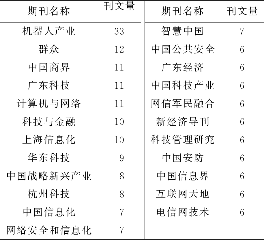 期刊名称刊文量机器人产业33群众12中国商界11广东科技11计算机与网络11科技与金融10上海信息化10华东科技9中国战略新兴产业8杭州科技8中国信息化7网络安全和信息化7期刊名称刊文量智慧中国7中国公共安全6广东经济6中国科技产业6网信军民融合6新经济导刊6科技管理研究6中国安防6中国信息界6互联网天地6电信网技术6