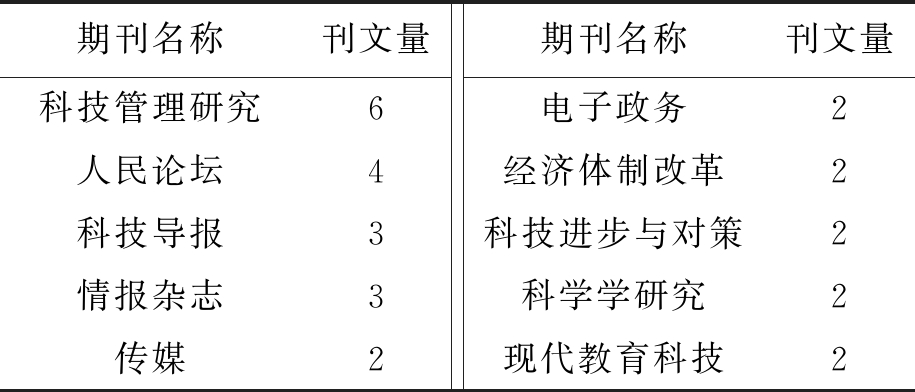期刊名称刊文量科技管理研究6人民论坛4科技导报3情报杂志3传媒2期刊名称刊文量电子政务2经济体制改革2科技进步与对策2科学学研究2现代教育科技2