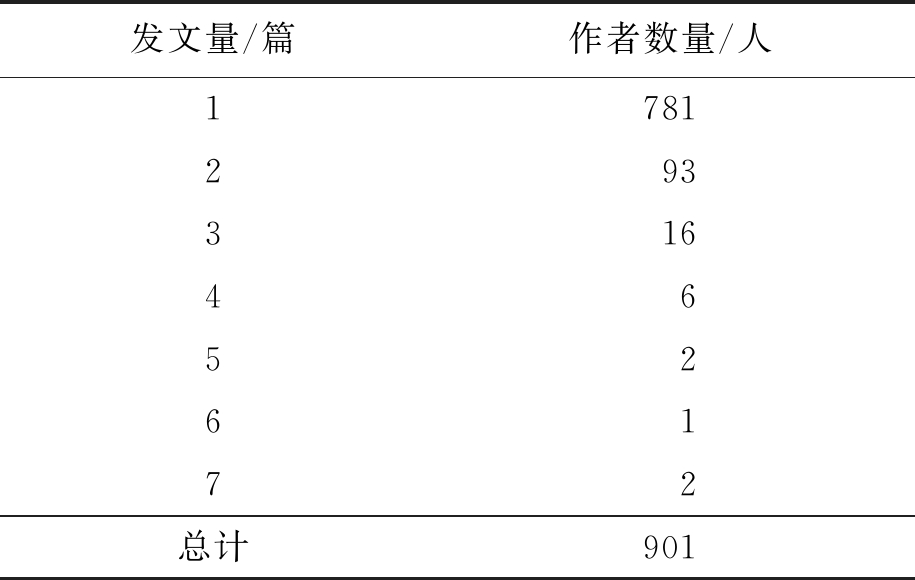 对686篇样本文献的作者进行统计,发现共有901位作者,其中发文1篇的有781位。洛特卡定律指出,假如一个研究领域中发文量为1篇的作者数约为发文量为N篇的作者数的N2倍,且发文量为1篇的作者数约占作者总量的60%[17],则表示该研究领域成熟。据此推算出发文量2~7篇的作者数应分别为195、87、49、31、22、16。表4是作者发文量统计,发文2~7篇的作者数分别是93、16、6、2、1、2,发文1篇的作者约占总数的86.68%。由此可见,实际值与按照洛特卡定律得出的理论值有着非常大的差距。这表明我国人工智能产业研究的作者分布不够理想,尚未呈现成熟研究领域所对应的作者分布状态,学者们还需进一步提高对该领域研究的重视程度,推动研究逐步走向成熟。