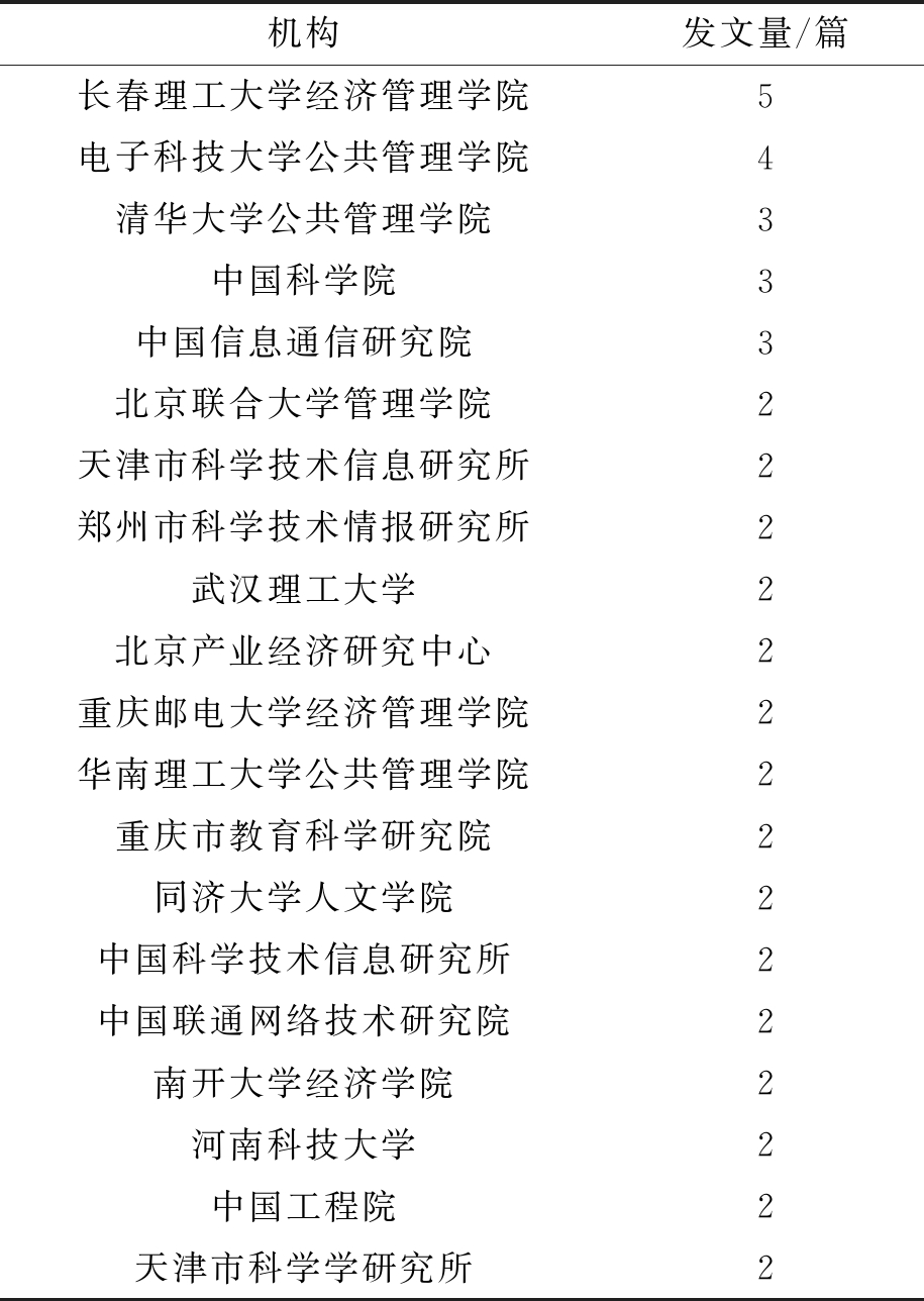 机构发文量/篇长春理工大学经济管理学院5电子科技大学公共管理学院4清华大学公共管理学院3中国科学院3中国信息通信研究院3北京联合大学管理学院2天津市科学技术信息研究所2郑州市科学技术情报研究所2武汉理工大学2北京产业经济研究中心2重庆邮电大学经济管理学院2华南理工大学公共管理学院2重庆市教育科学研究院2同济大学人文学院2中国科学技术信息研究所2中国联通网络技术研究院2南开大学经济学院2河南科技大学2中国工程院2天津市科学学研究所2