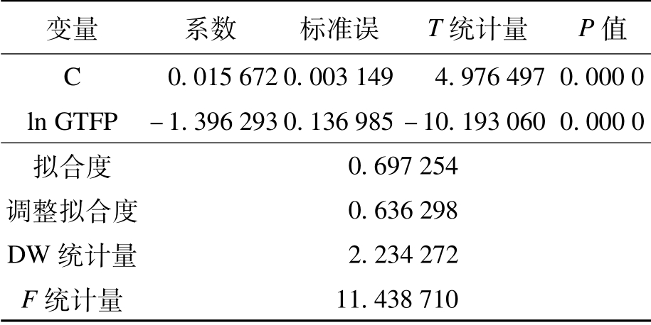 变量 系数 标准误 T统计量 P值C 0.015 6720.003 149 4.976 497 0.000 0 ln GTFP -1.396 293 0.136 985-10.193 060 0.000 0拟合度0.697 254调整拟合度 0.636 298 DW 统计量 2.234 272 F统计量11.438 710