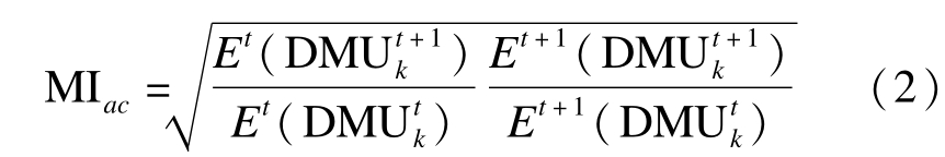 式中:Et+1(DMU tk)与Et(DMU tk)是DMU tk分别在t+1期和t期的技术效率值;Et+1(DMU t+1k )和Et(DMU t+1k )是DMU t+1k 分别在t+1期和t期的技术效率值。对两个时期的DMU进行交叉比较后取几何平均值,即所得的Malmquist指数。