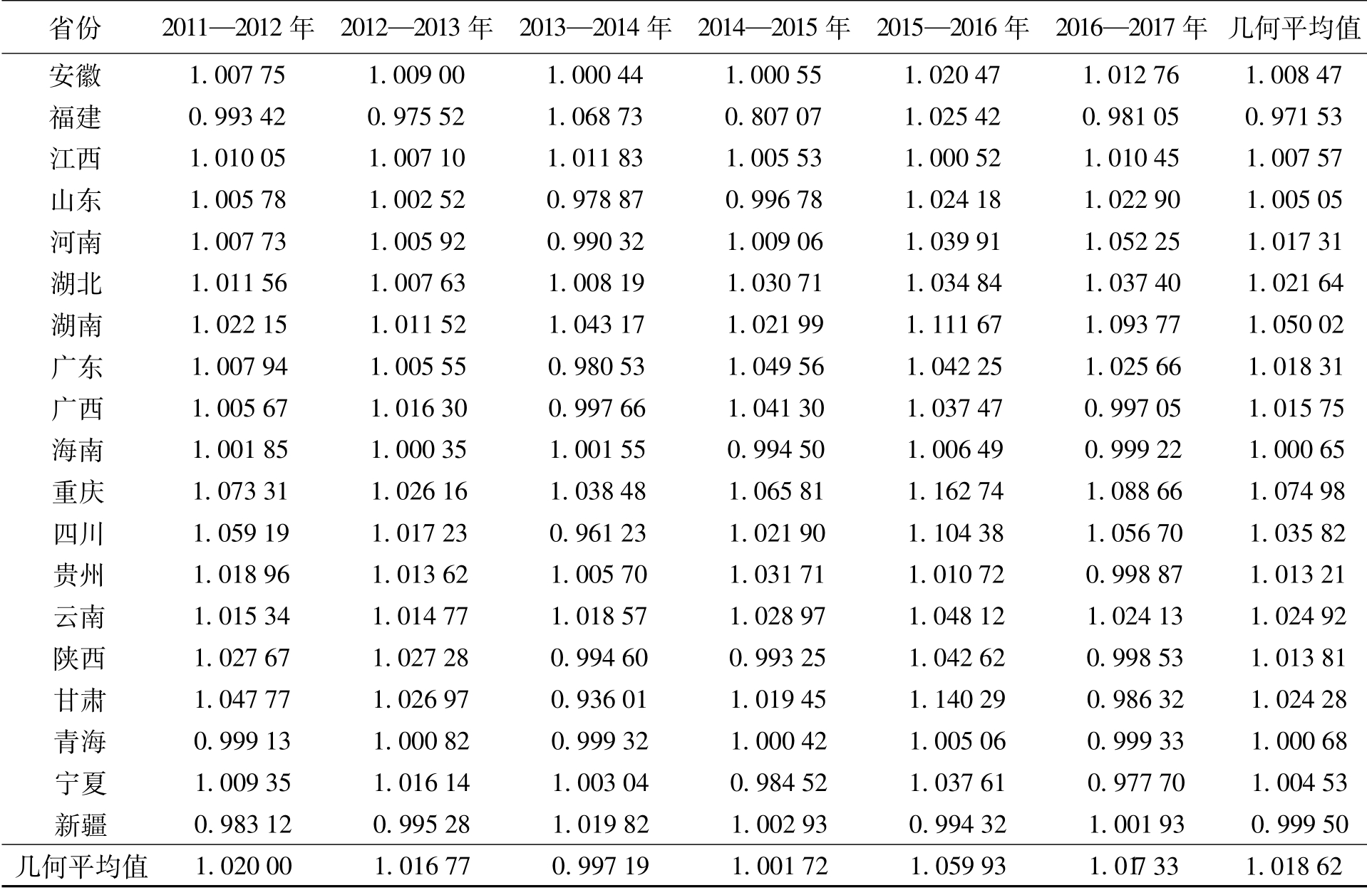 省份 2011—2012年 2012—2013年 2013—2014年 2014—2015年 2015—2016年 2016—2017年 几何平均值安徽 1.007 75 1.009 00 1.000 44 1.000 55 1.020 47 1.01 2 76 1.008 47福建 0.993 42 0.975 52 1.068 73 0.807 07 1.025 42 0.981 05 0.971 53江西 1.010 05 1.007 10 1.011 83 1.005 53 1.000 52 1.010 45 1.007 57山东 1.005 78 1.002 52 0.978 87 0.996 78 1.024 18 1.022 90 1.005 05河南 1.007 73 1.005 92 0.990 32 1.009 06 1.039 91 1.052 25 1.017 31湖北 1.011 56 1.007 63 1.008 19 1.030 71 1.034 84 1.037 40 1.021 64湖南 1.022 15 1.011 52 1.043 17 1.021 99 1.111 67 1.093 77 1.050 02广东 1.007 94 1.005 55 0.980 53 1.049 56 1.042 25 1.025 66 1.018 31广西 1.005 67 1.016 30 0.997 66 1.041 30 1.037 47 0.997 05 1.015 75海南 1.001 85 1.000 35 1.001 55 0.994 50 1.006 49 0.999 22 1.000 65重庆 1.073 31 1.026 16 1.038 48 1.065 81 1.162 74 1.088 66 1.074 98四川 1.059 19 1.017 23 0.961 23 1.021 90 1.104 38 1.056 70 1.035 82贵州 1.018 96 1.013 62 1.005 70 1.031 71 1.010 72 0.998 87 1.013 21云南 1.015 34 1.014 77 1.018 57 1.028 97 1.048 12 1.024 13 1.024 92陕西 1.027 67 1.027 28 0.994 60 0.993 25 1.042 62 0.998 53 1.013 81甘肃 1.047 77 1.026 97 0.936 01 1.019 45 1.140 29 0.986 32 1.024 28青海 0.999 13 1.000 82 0.999 32 1.000 42 1.005 06 0.999 33 1.000 68宁夏 1.009 35 1.016 14 1.003 04 0.984 52 1.037 61 0.977 70 1.004 53新疆 0.983 12 0.995 28 1.019 82 1.002 93 0.994 32 1.001 93 0.999 50几何平均值 1.020 00 1.016 77 0.997 19 1.001 72 1.059 93 1.01 7 33 1.018 62