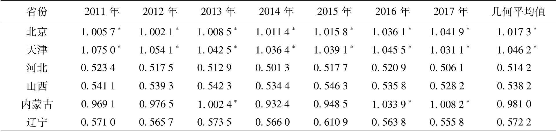 省份 2011年 2012年 2013年 2014年 2015年 2016年 2017年 几何平均值北京 1.005 7*1.002 1*1.008 5*1.011 4*1.015 8*1.036 1*1.041 9* 1.017 3*天津 1.075 0*1.054 1*1.042 5*1.036 4*1.039 1*1.045 5*1.031 1* 1.046 2*河北 0.523 4 0.517 5 0.512 9 0.501 3 0.517 7 0.520 9 0.506 1 0.514 2山西 0.541 1 0.539 3 0.542 3 0.534 4 0.546 3 0.535 8 0.528 2 0.538 2内蒙古 0.969 1 0.976 5 1.002 4*0.932 4 0.948 5 1.033 9*1.008 2* 0.981 0辽宁 0.571 0 0.565 7 0.573 5 0.566 0 0.610 9 0.563 8 0.5 55 8 0.572 2