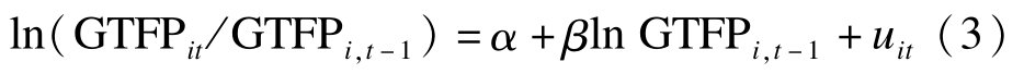 条件β收敛检验用于研究各经济体从长期来看是否存在动态演化趋势,以及各经济体之间的经济差距是否随时间推移而缩小。条件β收敛是相对于绝对β收敛而言的。绝对β收敛检验中,各经济体趋于收敛的是同一个稳定状态;而条件β收敛检验中,各经济体趋向于各自的稳定状态。所以条件β收敛假设不同经济体的基础条件和特征存在本质不同,承认发达经济体与欠发达经济体之间的差距始终存在[6]。因此,条件β收敛检验方法主要用于检验各经济体是否随时间推移而趋向各自的稳定状态。